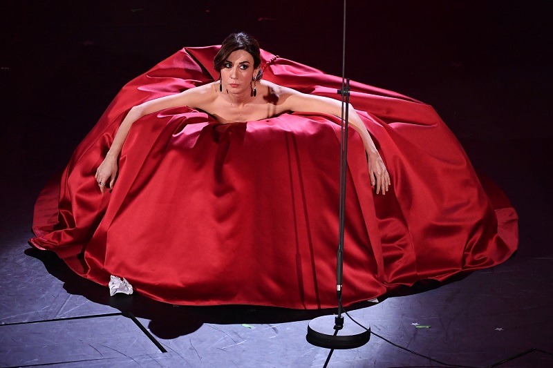Ma il secondo abito di Atelier Emé ci ha lasciati senza fiato. Il rosso cardinalizio e l'immenso gonnellone ha esaltato la figura della comica, che è anche sprofondata nella "corolla" carminia durante uno sketch, trasformandosi quasi in un fiore. Magico.