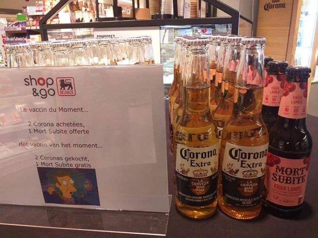 Dopo il bonus, il malus. Decisamente meno indovinata la promozione lanciata in Belgio dal supermercato Delhaize: per ogni due Corona acquistate, una Mort Subite (‘Morte Immediata’, è una birra belga) in omaggio. «È il vaccino del momento», recita il cartello sullo scaffale. Magari bastasse bere un paio di birre…