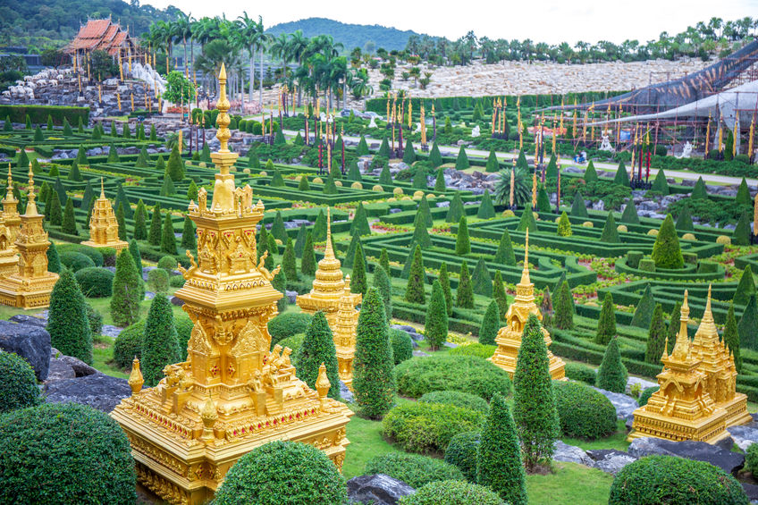 Il Suan Nong Nooch ospita oltre 600 mq di piante, fiori ornamentali tropicali Siepi intagliate case in tipico stile orientale e pagode.